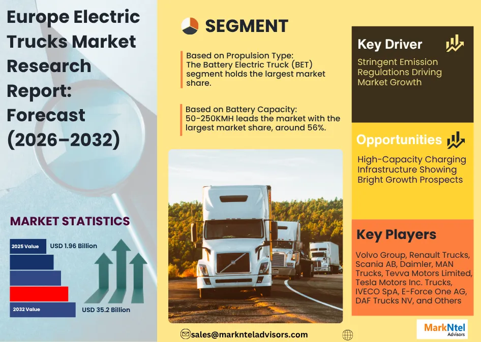 According to MarkNtel Advisors study The future of Europe Electric Trucks Market size is valued at around USD 1.96 billion in 2025 and is projected to reach USD 35.2 billion by 2032. Along with this, the market is estimated to grow at a CAGR of around 51.07% during the forecast period, i.e., 2026-32.