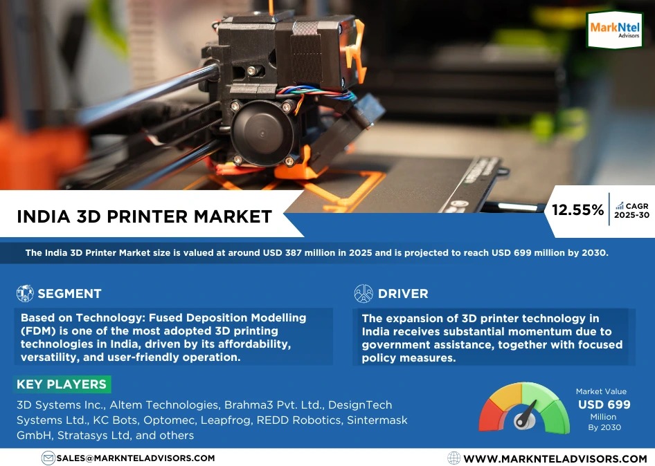 As per recent study by MarkNtel Advisors The India 3D Printer Market size is valued at around USD 387 million in 2025 and is projected to reach USD 699 million by 2030. Along with this, the market is estimated to grow at a CAGR of around 12.55% during the forecast period, i.e., 2025-30.
