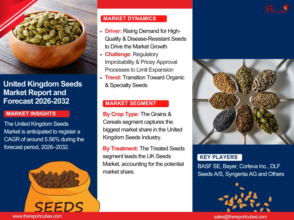 According to the latest report by The Report Cube, study United Kingdom Seeds Market is anticipated to reach USD 1.241 Billion through 2032 and would register a CAGR of around 5.56% during the forecast period, 2026–2032. The industry is compelled by the elevated demand for high-quality seeds, increasing acceptance of genetically improved & disease-resistant seed varieties, and the growing prominence of sustainable agriculture. Also, budding awareness among farmers, regarding pests & diseases, and climate-resilient crops is motivating the application of advanced vegetable seeds & hybrid crop varieties.