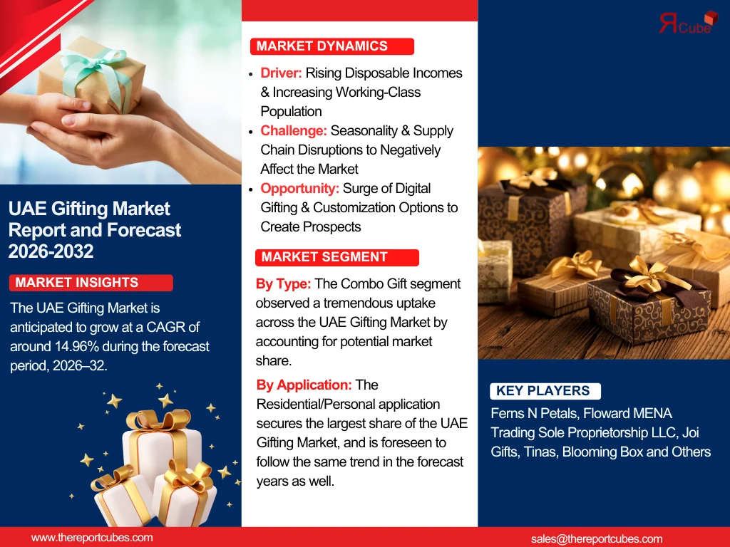 According to the latest report by The Report Cube, study UAE Gifting Market is anticipated to grow at a CAGR of around 14.96% during the forecast period, 2026–32. The industry is predicted to expand owing to a combination of socio-economic & cultural factors. The increasing disposable income of residents, an expanding working-class population across the nation, and the rising trend of celebrating occasions like birthdays, anniversaries, corporate events, and religious festivals have considerably elevated market demand for diverse gifting options.