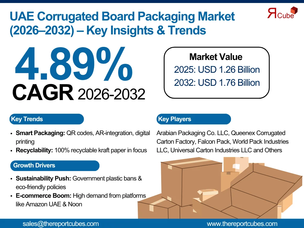 According to the latest report by The Report Cube, study UAE Corrugated Board Packaging Market is anticipated to register a CAGR of around 4.89% during the forecast period, 2026–32. The market size was valued at nearly USD 1.26 billion in 2025, and is projected to reach approximately USD 1.76 billion by 2032. The growth of the market is compelled by varied sustainability initiatives, the solid demand from the e-commerce sector, and the surge in customer goods & industrial packaging. Also, corrugated packaging is broadly utilized owing to its recyclability, cost-effectiveness, and ability to support heavy goods while protecting them during transit.