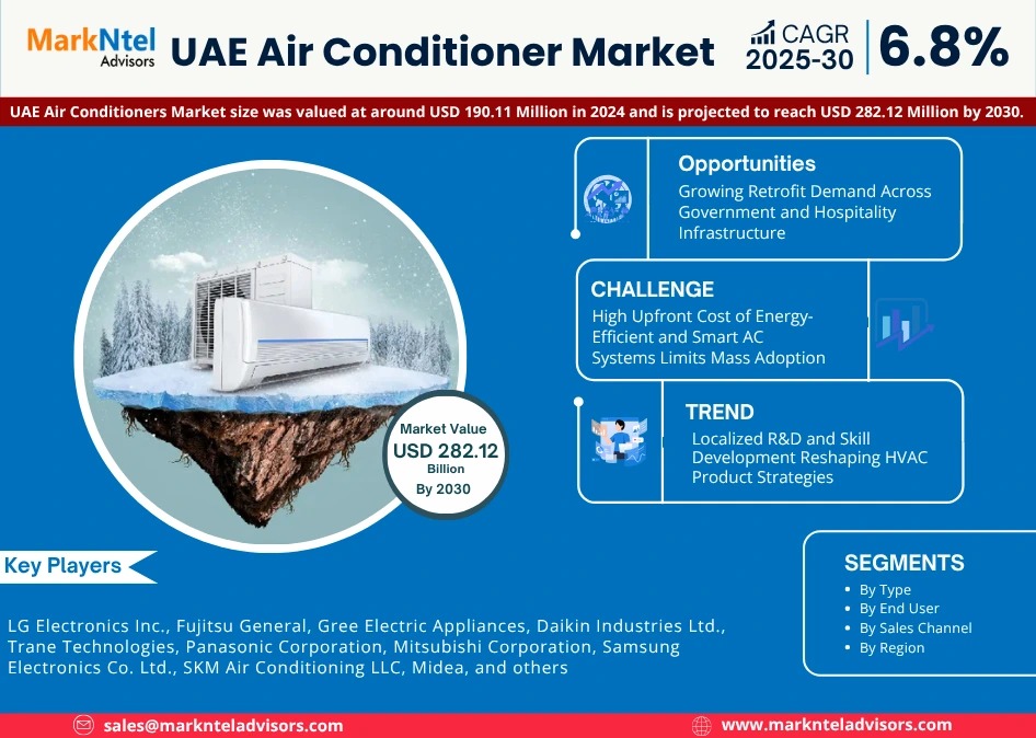 MarkNtel Advisors, a leading market research and consulting firm, has announced the release of its latest study titled UAE Air Conditioner Market Research Report: Forecast (2025–2030). This report provides a detailed assessment of the UAE Air Conditioner, covering its evolving dynamics, emerging trends, key growth drivers, major challenges, and competitive landscape.
