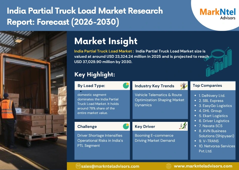 As per recent study by MarkNtel Advisors The India Partial Truck Load Market size is valued at around USD 23,324.24 million in 2025 and is projected to reach USD 37,029.90 million by 2030. Along with this, the market is estimated to grow at a CAGR of around 9.7% during the forecast period, i.e., 2026-30.