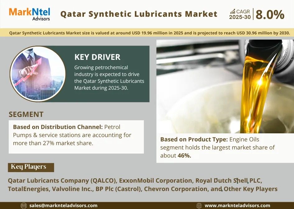 As per recent study by MarkNtel Advisors The Qatar Synthetic Lubricants Market size is valued at around USD 19.96 million in 2025 and is projected to reach USD 30.96 million by 2030. Along with this, the market is estimated to grow at a CAGR of around 8% during the forecast period, i.e., 2025-30.