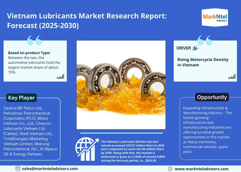 As per recent study by MarkNtel Advisors The Vietnam Lubricants Market size was valued at around 319.57 million liters in 2024 and is expected to reach 423.38 million liters by 2030. Along with this, the market is estimated to grow at a CAGR of around 4.80% during the forecast period, i.e., 2025-30.