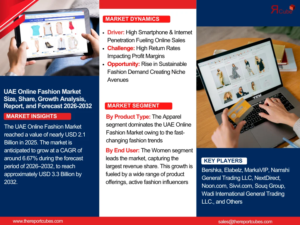 According to the latest report by The Report Cube, study UAE Online Fashion Market is anticipated to grow at a CAGR of around 6.67% during the forecast period of 2026–2032, to reach approximately USD 3.3 Billion by 2032. The industry's growth is being accelerated by the increasing digital penetration, high smartphone usage, and growing consumer preference for fashion shopping through online channels.