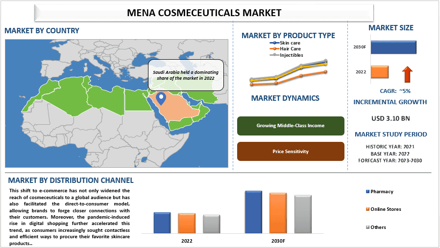The global scenario of the “MENA Cosmeceuticals market” report, the global market was valued at USD 3.10 billion in 2022, growing at a CAGR of 5% during the forecast period from 2023 - 2030 to reach USD billion by 2030.