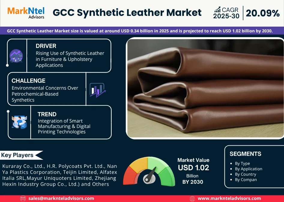 According to MarkNtel Advisors study The future of GCC Synthetic Leather Additives Market size is valued at around USD 0.34 billion in 2025 and is projected to reach USD 1.02 billion by 2030. Along with this, the market is estimated to grow at a CAGR of around 20.09% during the forecast period, i.e., 2025-30.