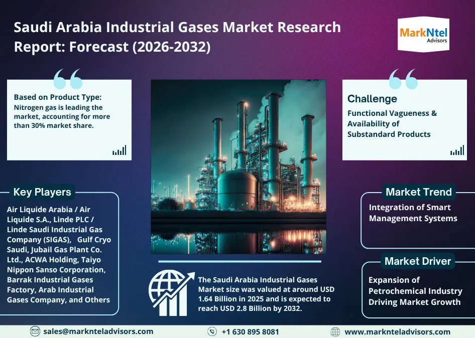 According to MarkNtel Advisors study The future of Saudi Arabia Industrial Gases Market size was valued at around USD 1.64 Billion in 2025 and is expected to reach USD 2.8 Billion by 2032. Along with this, the market is estimated to grow at a CAGR of around 5.48% during the forecast period, i.e., 2026-32.