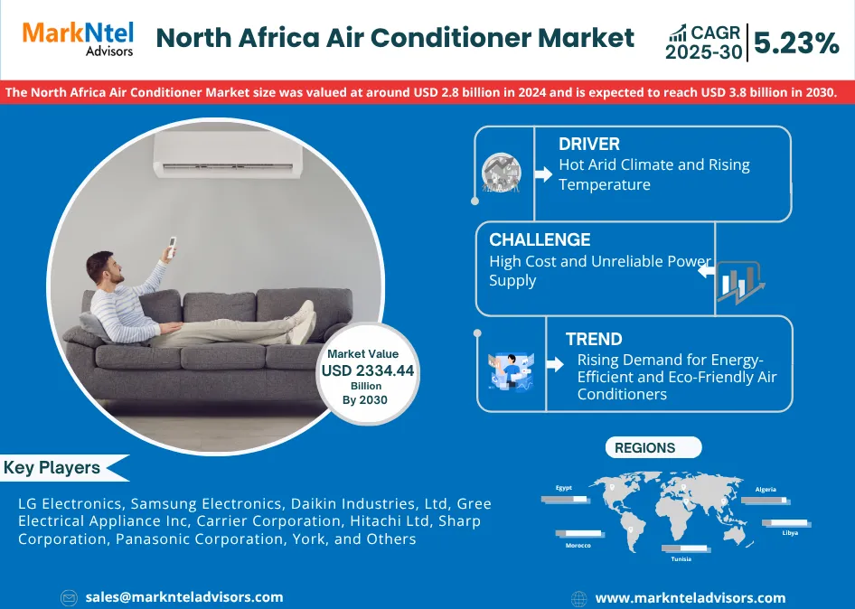 As per recent study by MarkNtel Advisors The North Africa Air Conditioner Market size was valued at around USD 2.8 billion in 2024 and is expected to reach USD 3.8 billion in 2030. Along with this, the market is estimated to grow at a CAGR of around 5.23% during the forecast period, i.e., 2025-30.