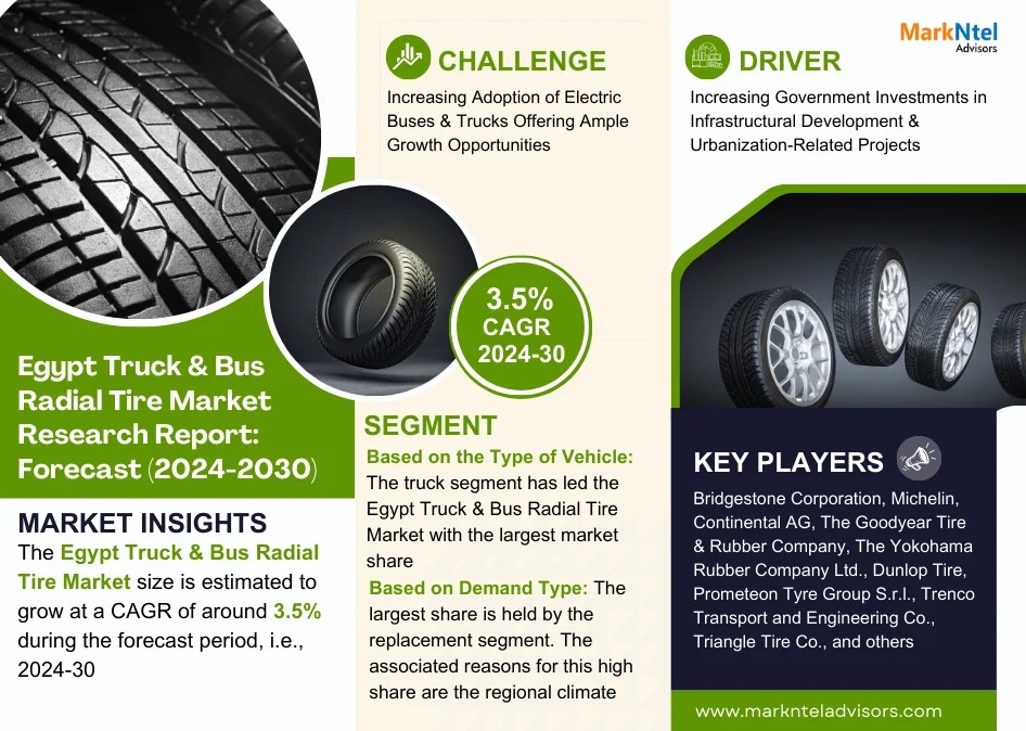 As per recent study by MarkNtel Advisors The Egypt Truck & Bus Radial Tire Market size is estimated to grow at a CAGR of around 3.5% during the forecast period, i.e., 2024-30.