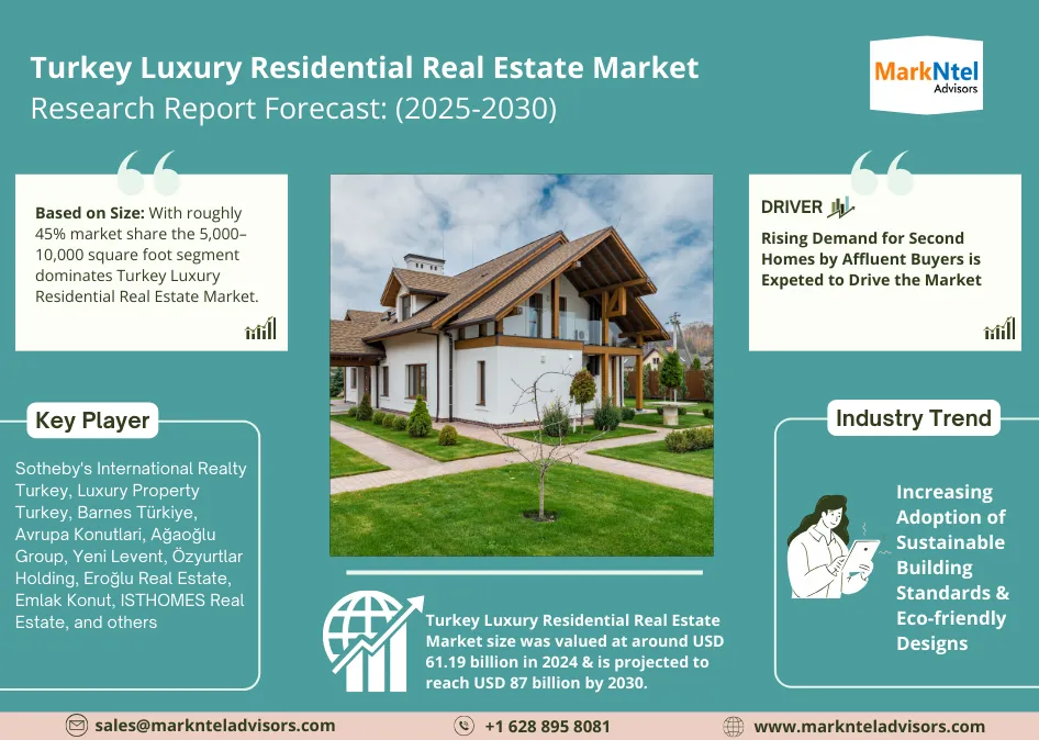 According to MarkNtel Advisors study The future of Turkey Luxury Residential Real Estate Market size was valued at around USD 61.19 billion in 2024 and is projected to reach USD 87 billion by 2030. Along with this, the market is estimated to grow at a CAGR of around 6.11% during the forecast period, i.e., 2025-30.