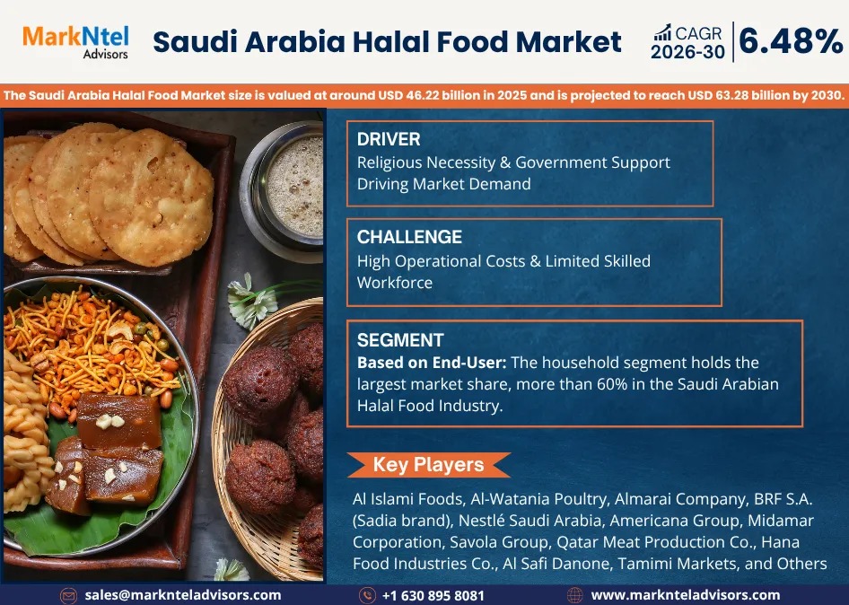 According to MarkNtel Advisors study The future of Saudi Arabia Halal Food Market size is valued at around USD 46.22 billion in 2025 and is projected to reach USD 63.28 billion by 2030. Along with this, the market is estimated to grow at a CAGR of around 6.48% during the forecast period, i.e., 2026-30.