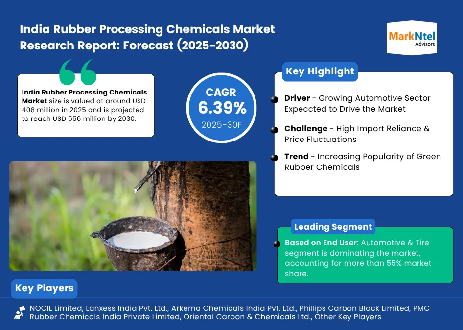 As per recent study by Markntel Advisors The India Rubber Processing Chemicals Market size is valued at around USD 408 million in 2025 and is projected to reach USD 556 million by 2030. Along with this, the market is estimated to grow at a CAGR of around 6.39% during the forecast period, i.e., 2025-30.