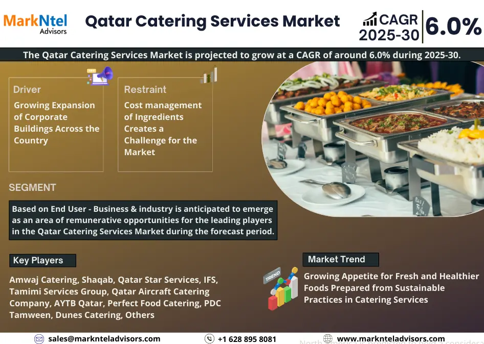 According to MarkNtel Advisors study The future of Qatar Catering Services Market is projected to grow at a CAGR of around 6.0% during the forecast period, i.e., 2025-30. The growing support by the government to diversify the country’s economy strongly contributes to the growth of the market as the government is focusing on the non-oil sectors such as tourism and healthcare.