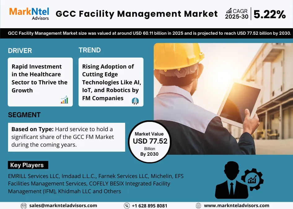 According to MarkNtel Advisors study The future of GCC Facility Management Market size was valued at around USD 60.11 billion in 2025 and is projected to reach USD 77.52 billion by 2030. Along with this, the market is estimated to grow at a CAGR of around 5.22% during the forecast period, i.e., 2025-30.
