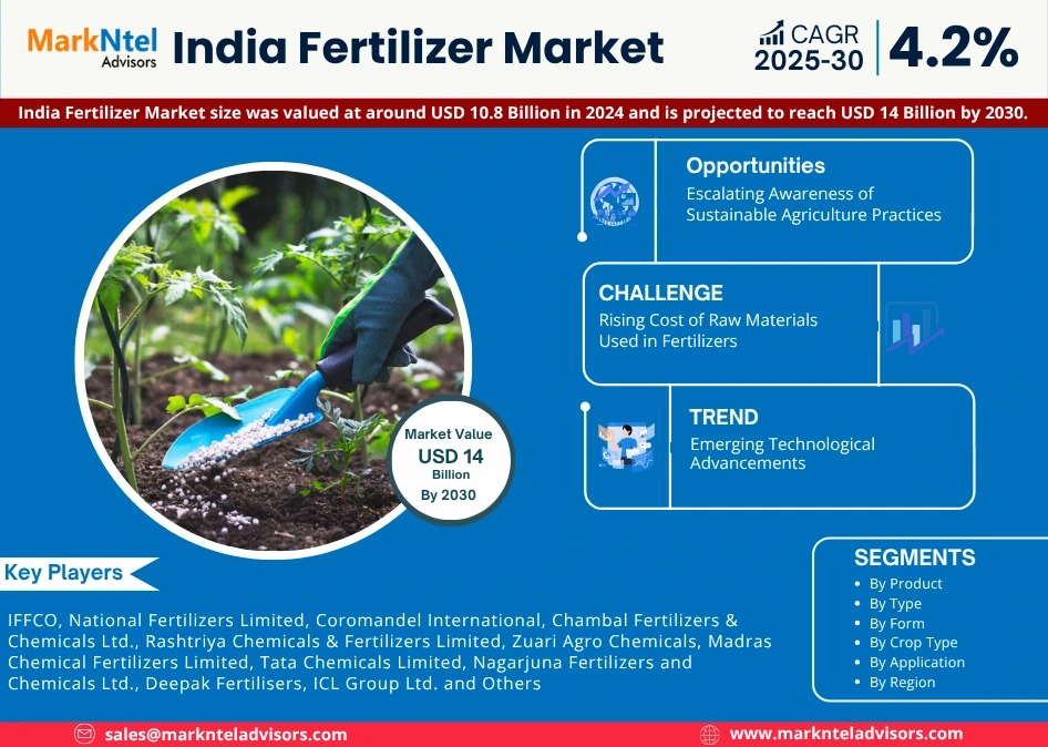As per recent study by Markntel Advisors India Fertilizer Market size was valued at around USD 10.8 Billion in 2024 and is projected to reach USD 14 Billion by 2030. Along with this, the market is estimated to grow at a CAGR of around 4.2% during the forecast period, i.e., 2025-30. India's Fertilizer market is increasing due to the growing demand for fertilizers to enhance agricultural productivity.