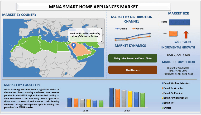 The MENA Smart Home Appliances Market was valued at USD 2,221.7 Million in 2022 and is expected to grow at a strong CAGR of around 28.8% during the forecast period (2023-2030).