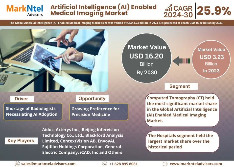 The Global Artificial Intelligence (AI) Enabled Medical Imaging Components Market size was valued at around USD 3.23 billion in 2023 & is projected to reach around USD 16.20 billion by 2030. Along with this, the market is estimated to grow at a CAGR of around 25.9% during the forecast period, i.e., 2025-30. According to MarkNtel Advisors Study.