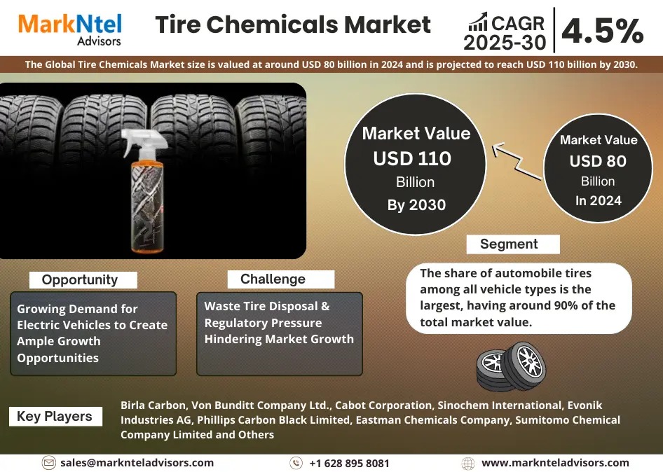 The Global Tire Chemicals Components Market size is valued at around USD 80 billion in 2024 and is projected to reach USD 110 billion by 2030. Along with this, the market is estimated to grow at a CAGR of around 4.5 % during the forecast period, i.e., 2025-30. According to MarkNtel Advisors Study.