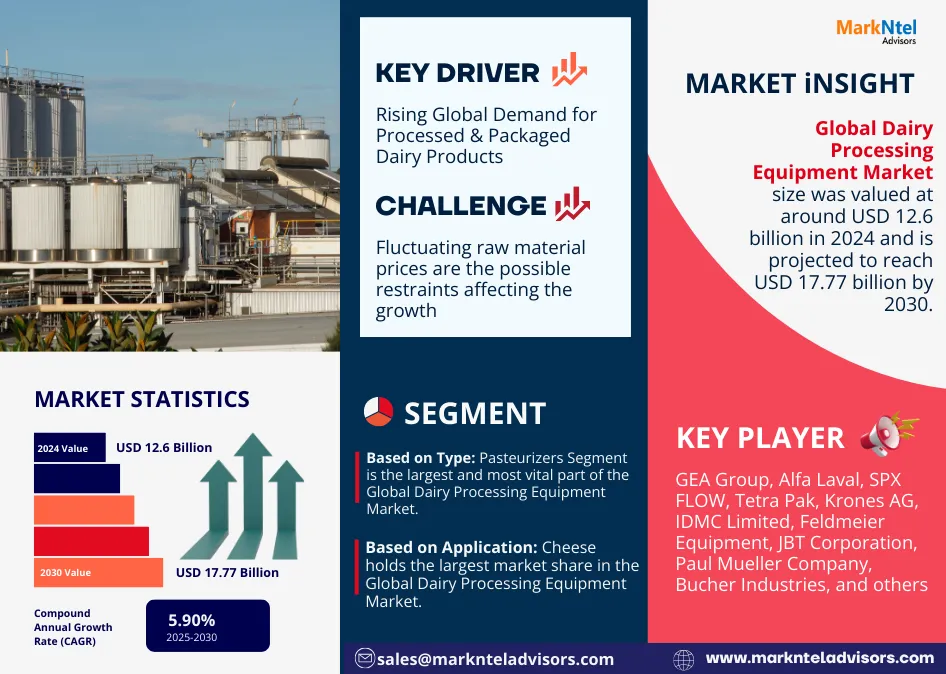 The Global Dairy Processing Equipment Market size was valued at around USD 12.6 billion in 2024 and is projected to reach USD 17.77 billion by 2030. Along with this, the market is estimated to grow at a CAGR of around 5.90% during the forecast period, i.e., 2025-30. According to MarkNtel Advisors Study.