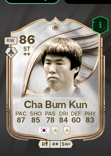 Bum Kun Cha's Icon card is an 86-rated Striker, featuring standout attributes such as 87 Pace, 85 Shooting, 84 Dribbling, and 83 Physicality. As a striker, this card excels as a sharp and clinical attacker, capable of exploiting defensive gaps with blistering speed and precise finishing. With his excellent dribbling and physical presence, he can break through opposition lines, create scoring opportunities, and decisively seal victories in crucial moments.