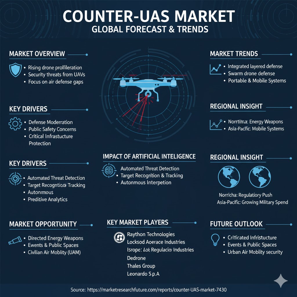 Globally, the Counter UAS Market is expanding due to rising defense expenditures, asymmetric warfare threats, and drone proliferation. Countries are prioritizing layered defense systems capable of countering diverse drone types—from small commercial UAVs to advanced military platforms.