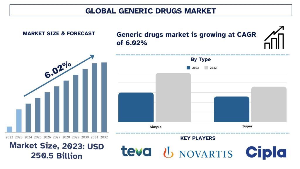 The Generic Drugs Market was valued at approximately USD 250.5 Billion in 2023 and is expected to grow at a robust CAGR of around 6.02% during the forecast period (2024-2032).
