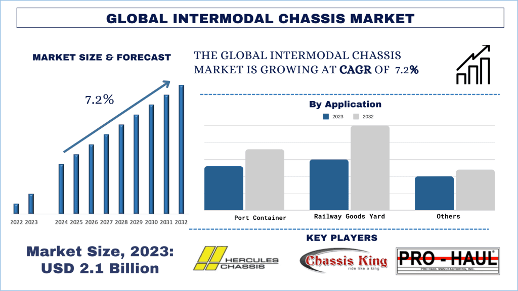 The Intermodal Chassis Market was valued at USD 2.1 Billion in 2023 and is expected to grow at a robust CAGR of around 7.2 % during the forecast period (2024-2032).