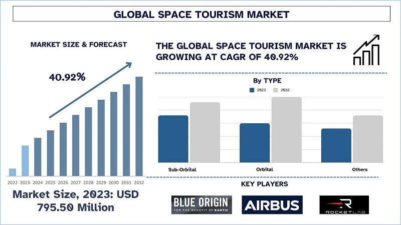 The Global Space Tourism market was valued at USD 795.50 million in 2023 and is expected to grow at a strong CAGR of around 40.92% during the forecast period (2024-2032)