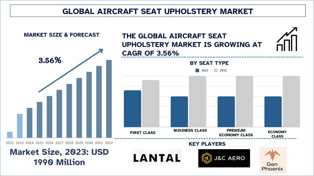 The aircraft seat upholstery market in the North America region has held a sizeable market share owing to the presence of a large number of commercial aircraft manufacturing companies as well as the high demand for aircraft from domestic and international airlines for new aircraft. According to the UnivDatos analysis, growing investments in aircraft seat upholstery for improving passenger experience, the sector will surge in demand for the Global Aircraft Seat Upholstery market, which will drive the global scenario of the “Global Aircraft Seat Upholstery Market” report; the global market was valued at USD 1990 million in 2023, growing at a CAGR of 3.56% during the forecast period from 2024 - 2032 to reach USD million by 2032.