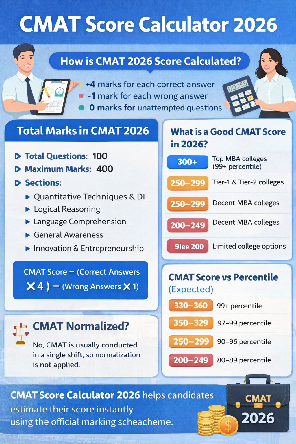 The CMAT Score Calculator 2026 helps candidates quickly estimate their score using the official marking scheme. A score above 250 significantly improves chances of admission to top AICTE-approved MBA colleges in India.