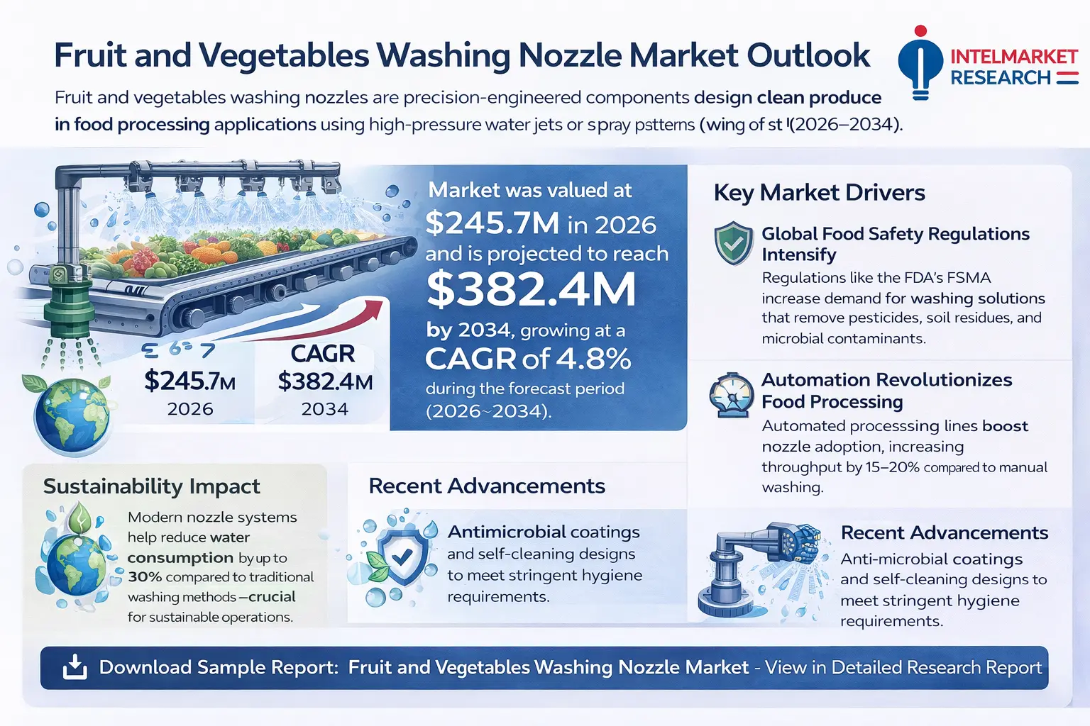 According to a new report from Intel Market Research, Global Fruit and Vegetables Washing Nozzle market was valued at USD 245.7 million in 2025 and is projected to reach USD 382.4 million by 2034, growing at a CAGR of 4.8% during the forecast period (2026–2034). This growth is driven by stringent food safety regulations, increasing automation in food processing, and rising demand for water-efficient cleaning solutions.