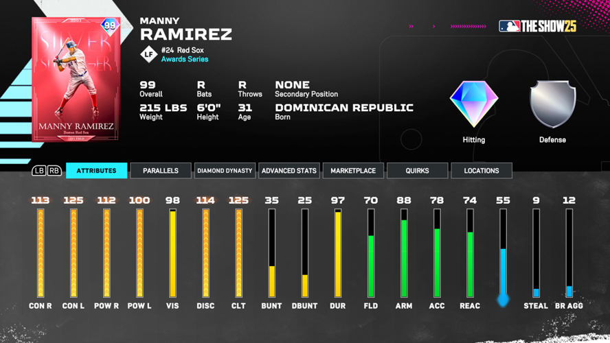 This card boasts contact and power stats all exceeding 100, complemented by an exceptional 98 vision—particularly remarkable for a Manny card.