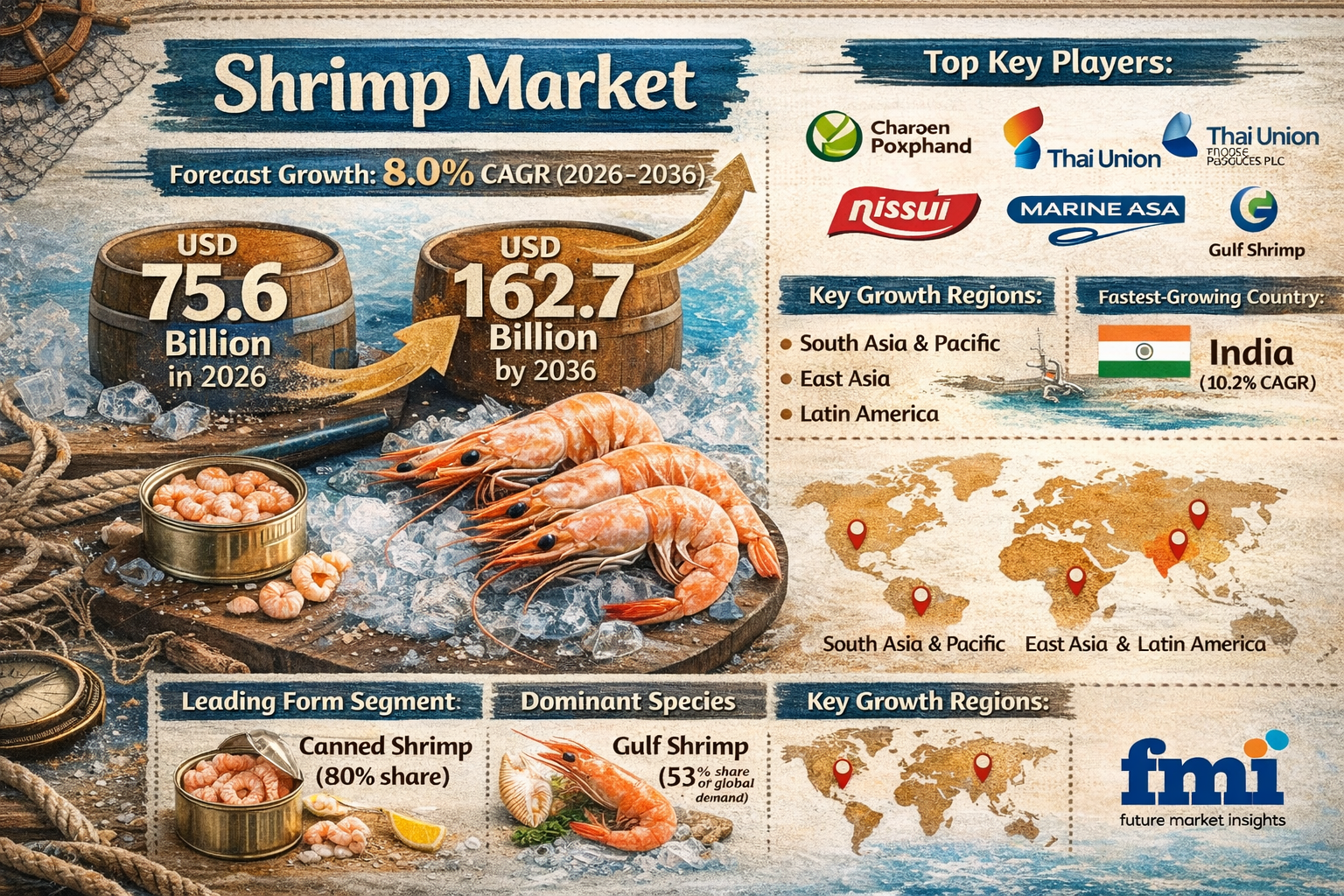 February 11, 2026 –The global shrimp market is witnessing unprecedented growth, driven by rising consumer demand for high-protein seafood, expanding aquaculture capacities, and an increasing appetite for processed and value-added shrimp products across retail and foodservice sectors. Valued at USD 75.6 billion in 2026, the market is projected to reach USD 162.7 billion by 2036, registering a robust compound annual growth rate (CAGR) of 8.0% over the forecast period.