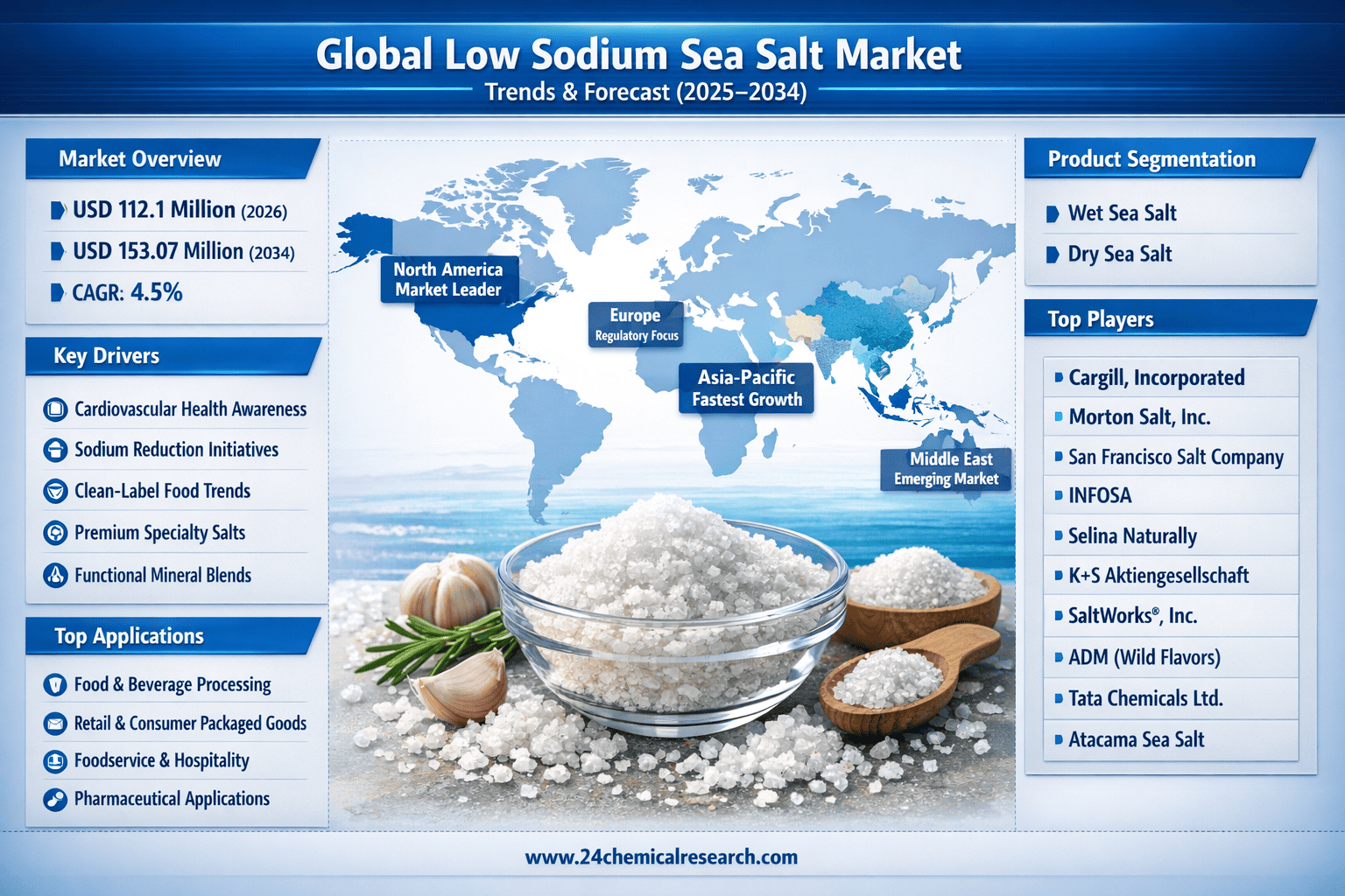 According to 24Chemical Research, Global Low Sodium Sea Salt market size was valued at USD 107.3 million in 2025. The market is projected to grow from USD 112.1 million in 2026 to USD 153.07 million by 2034, exhibiting a CAGR of 4.50% during the forecast period.