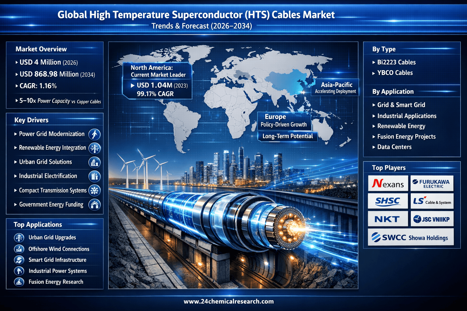 According to 24Chemical Research, Global High Temperature Superconductor (HTS) Cables Market is experiencing transformative growth, with its valuation reaching USD 4 million in 2026 and projected to skyrocket to USD 868.98 million by 2034, expanding at an impressive CAGR of 1.16%. This explosive growth trajectory is fueled by increasing adoption in power grid modernization projects and renewable energy infrastructure, where efficiency and space-saving advantages are critical.