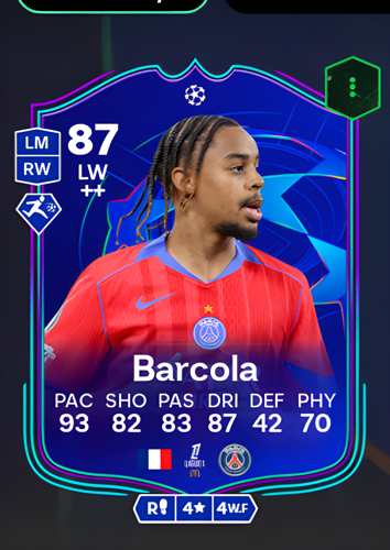 Introducing the exciting UCL Primetime Bradley Barcola card, an 87-rated Left Wing who brings electrifying pace and sharp attacking prowess to the virtual pitch. With standout attributes including a blistering 93 Pace, 87 Dribbling, and solid 82 Shooting and 83 Passing, this card is engineered for dynamic wing play. As a winger, Barcola's exceptional speed and close control make him a formidable weapon on the flank, perfectly suited to quickly tear apart the opposing team's defense. He excels at beating defenders one-on-one, creating dangerous opportunities, and is more than capable of seizing the moment to score a decisive goal and seal the deal in crucial matches.