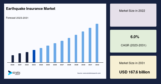 According to StraitsResearch, the global earthquake insurance market size is valued at in 2022 and is estimated to reach USD 167.6 billion by 2031, growing at a CAGR of 6% during 2023-2031.