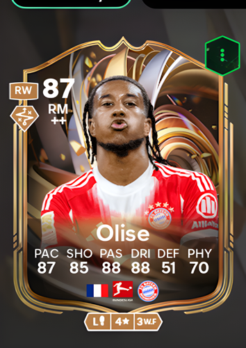 Michael Olise’s Ratings Reload card stands out as a dynamic Right Midfielder, boasting an impressive overall rating of 87. With remarkable attributes such as 87 pace, 85 shooting, 88 passing, and 88 dribbling, Olise is primed to be a sharp attacking force on the wing. His combination of speed and technical skill enables him to swiftly break through defensive lines, create scoring opportunities, and deliver precise passes, making him an invaluable asset for players looking to capitalize on quick transitions and decisive plays in the final third.