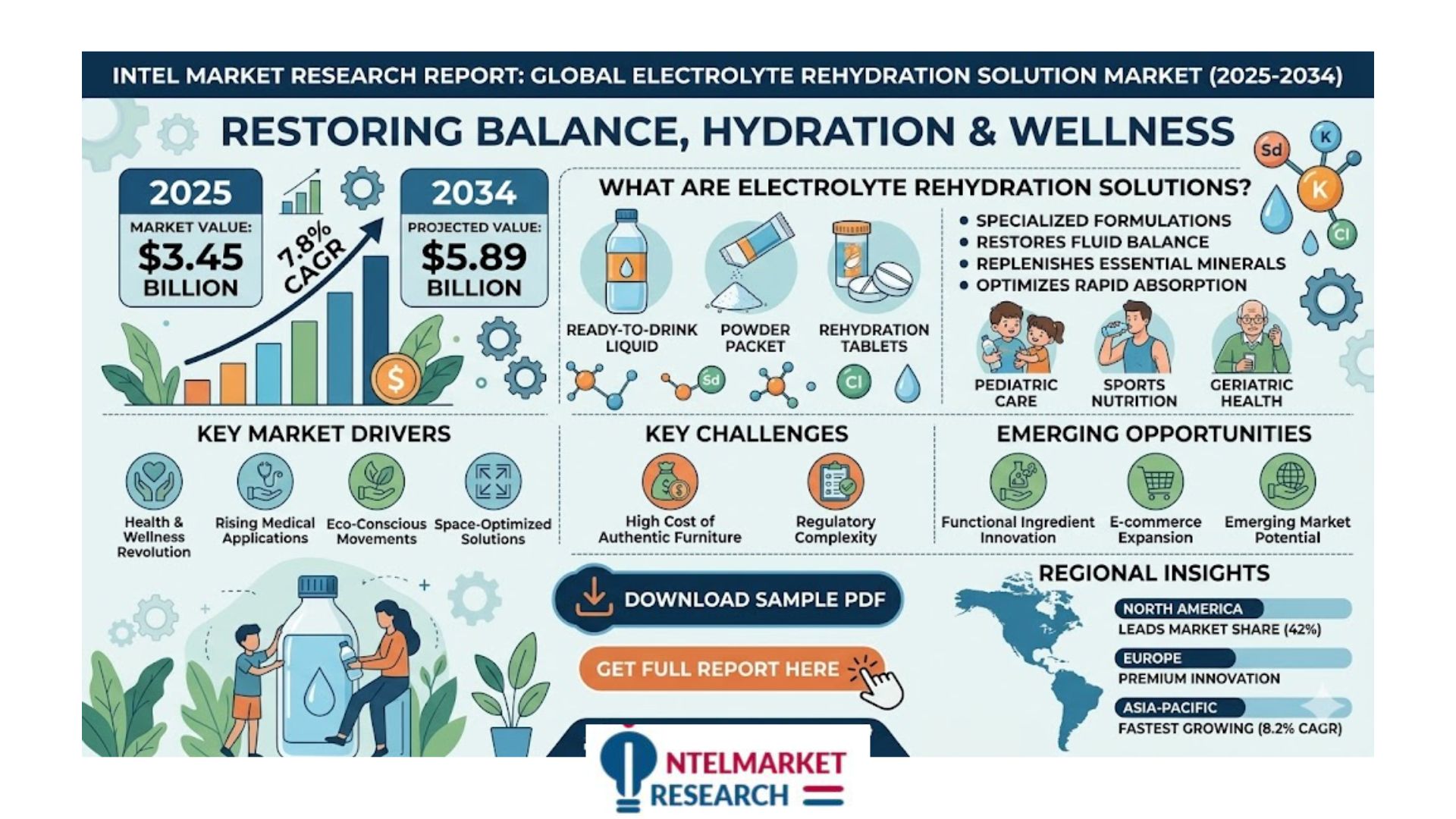 According to a new report from Intel Market Research, the global Electrolyte Rehydration Solution market was valued at USD 3.45 billion in 2025 and is projected to reach USD 5.89 billion by 2034, growing at a CAGR of 6.1% during the forecast period (2026–2034). This growth is driven by increasing health consciousness among consumers, rising incidence of dehydration-related medical conditions, and expanding applications in sports nutrition and pediatric care.