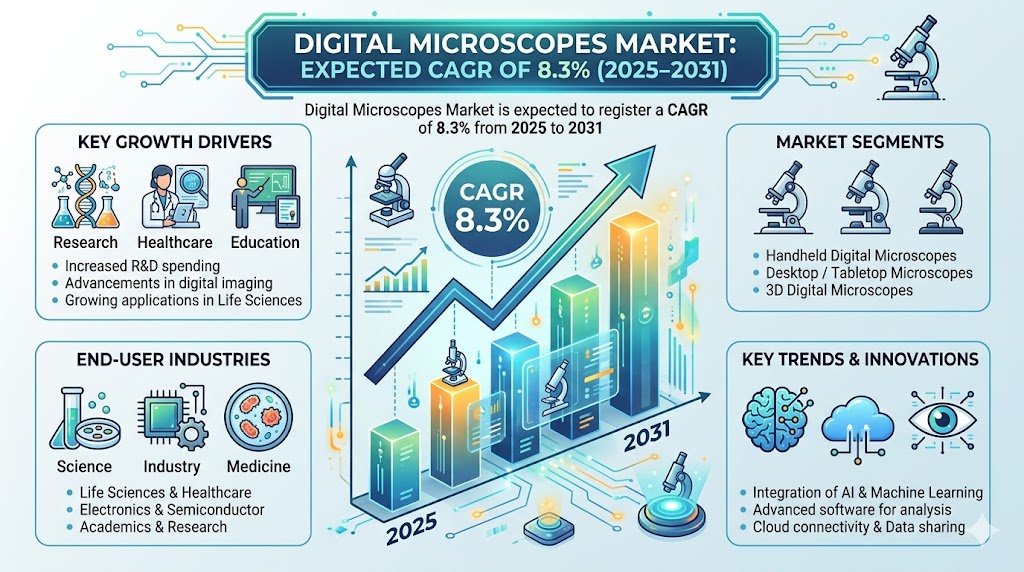 The Digital Microscopes Market Report Scope provides a comprehensive overview of the market by analyzing key segments, regional trends, and competitive dynamics. This report highlights adoption patterns across type, application, and end users, helping stakeholders understand growth potential and emerging opportunities. The Digital Microscopes Market is expected to register a CAGR of 8.3% from 2025 to 2031, reflecting the growing global demand for advanced microscopy solutions across multiple applications.