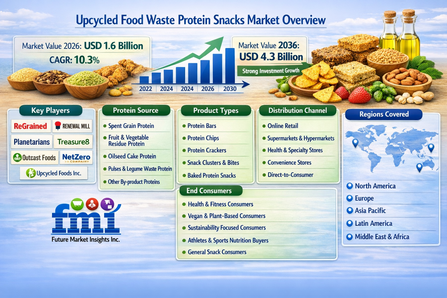 NEWARK, DELAWARE | March 23, 2026 — The global Upcycled Food Waste Protein Snacks market is undergoing a technical revolution, moving beyond "green" positioning toward functional dominance. Valued at USD 1.4 billion in 2025, the sector is poised to reach USD 1.6 billion in 2026. Driven by a 10.3% CAGR, the market is projected to hit USD 4.3 billion by 2036, according to Future Market Insights (FMI).