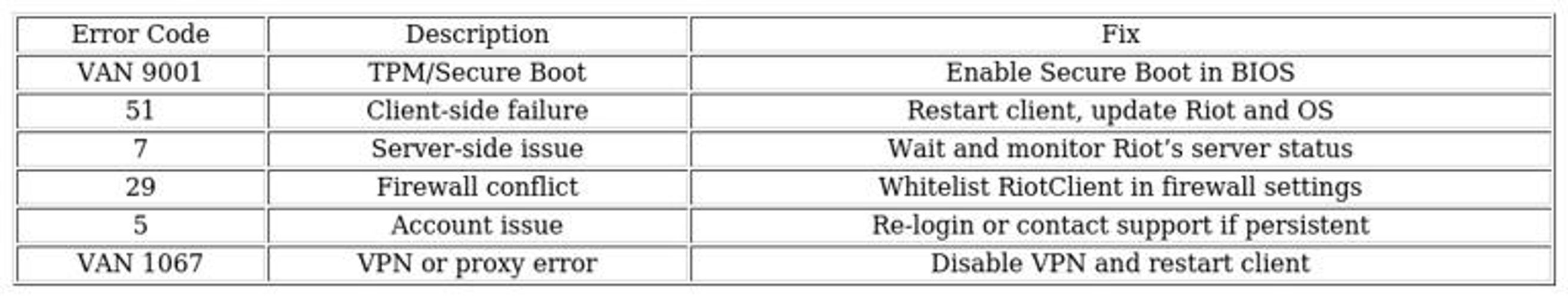 Vérifiez que votre système d’exploitation et vos pilotes graphiques sont à jour. Désactivez tout VPN, proxy ou logiciel de sécurité qui pourrait bloquer la connexion. Ajoutez le client Riot à la liste des exceptions de votre pare-feu ou antivirus pour éviter tout blocage.