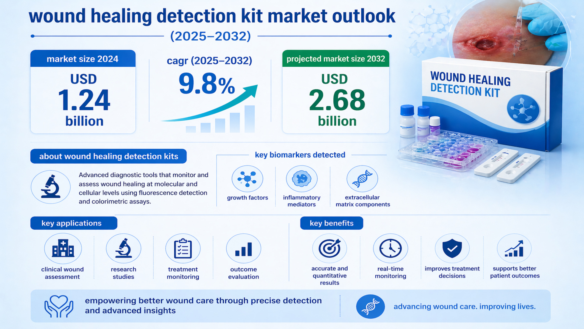 According to a newly published market research report by 24LifeSciencesglobal wound healing detection kit market was valued at USD 1.24 billion in 2024 and is projected to reach USD 2.68 billion by 2032, growing at a compound annual growth rate (CAGR) of 9.8% during the forecast period 2025–2032.