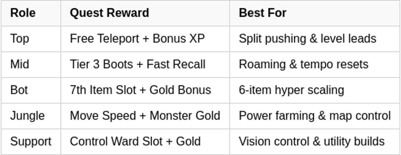 Junglers and supports keep their signature quest items but receive new perks: junglers with altered resource mechanics and supports with enhanced vision tools.
