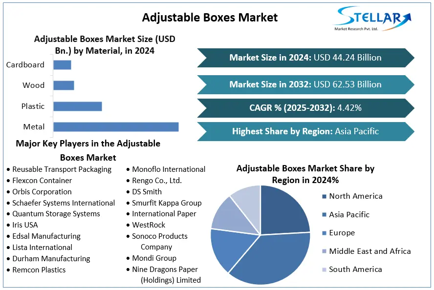 Adjustable Boxes Market size was valued at USD 44.24 Bn. in 2024 and the total Adjustable Boxes Market size is expected to grow at a CAGR of 4.42% from 2025 to 2032, reaching nearly USD 62.53 Bn. by 2032.