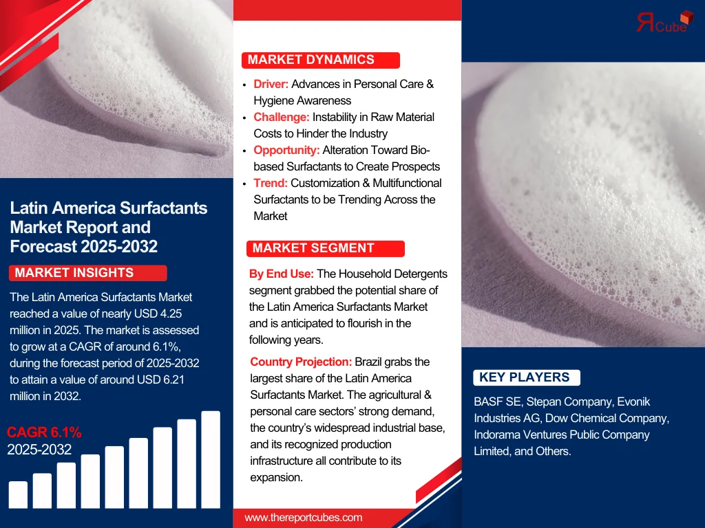 The Report Cube which is one of the leading market research company in UAE expects the Latin America Surfactants Market to grow at a CAGR of around 6.1% through 2032, as highlighted in their latest research report. The study provides an in-depth analysis of the emerging trends shaping the Latin America Surfactants Market and offers detailed forecasts for its potential growth during 2026–2032. The report also presents a comprehensive assessment of the competitive landscape, including profiles of leading players, their performance metrics, and recent strategic developments. Additionally, it explores the key market drivers, challenges, opportunities, and provides insights into historical and future revenue trends at the global, regional, and country levels.