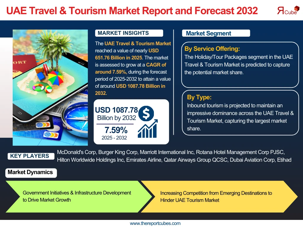 The Report Cube which is one of the leading market research company in UAE expects the UAE Travel & Tourism Market to grow at a CAGR of around 7.59% through 2032, as highlighted in their latest research report. The study provides an in-depth analysis of the emerging trends shaping the UAE Travel & Tourism Market and offers detailed forecasts for its potential growth during 2025–2032. The report also presents a comprehensive assessment of the competitive landscape, including profiles of leading players, their performance metrics, and recent strategic developments. Additionally, it explores the key market drivers, challenges, opportunities, and provides insights into historical and future revenue trends at the global, regional, and country levels.