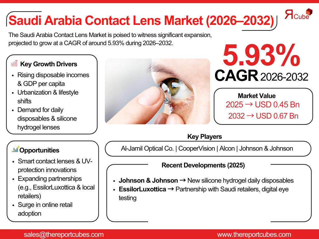 The Report Cube which is one of the leading market research company in UAE expects the Saudi Arabia Contact Lens Market to grow at a CAGR of around 5.93% through 2032, as highlighted in their latest research report. The study provides an in-depth analysis of the emerging trends shaping the Saudi Arabia Contact Lens Market and offers detailed forecasts for its potential growth during 2026–2032. The report also presents a comprehensive assessment of the competitive landscape, including profiles of leading players, their performance metrics, and recent strategic developments. Additionally, it explores the key market drivers, challenges, opportunities, and provides insights into historical and future revenue trends at the global, regional, and country levels.